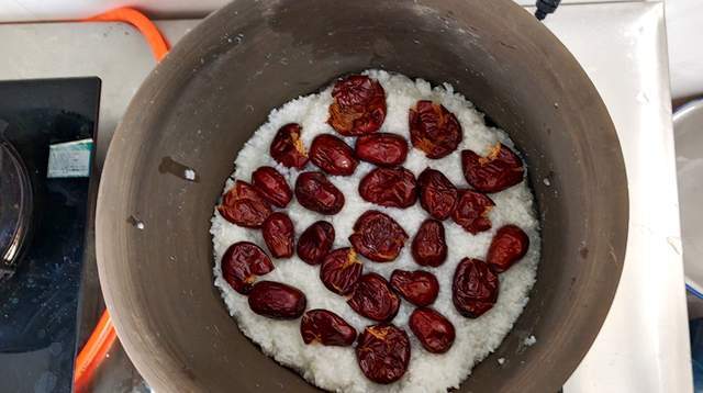 揭盖瞬间,蒸汽携着枣香米馥奔腾而出。米粒吸饱枣汁,色泽如琥珀般温润,绵韧柔滑;红枣早已化为深红蜜膏,与米粒交融难分。入口软糯甘甜,枣的醇厚与米的清润在舌尖达到完美平衡,余韵悠长。