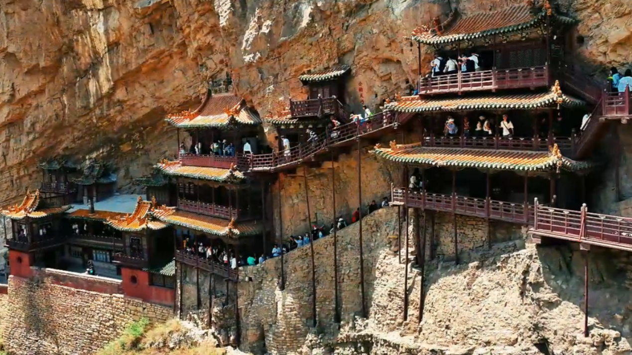 悬空寺镶嵌于恒山翠屏峰的绝壁之上,始建于北魏,至今已有1500多年历史,以巧妙的木构横梁深插岩壁,形成"悬空"奇观,入选《时代》周刊世界十大奇险建筑。