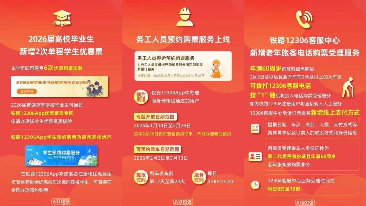 为2026届高校毕业生异地求职增加2次优惠购票次数,继续为学生、务工人员提供预约购票服务。