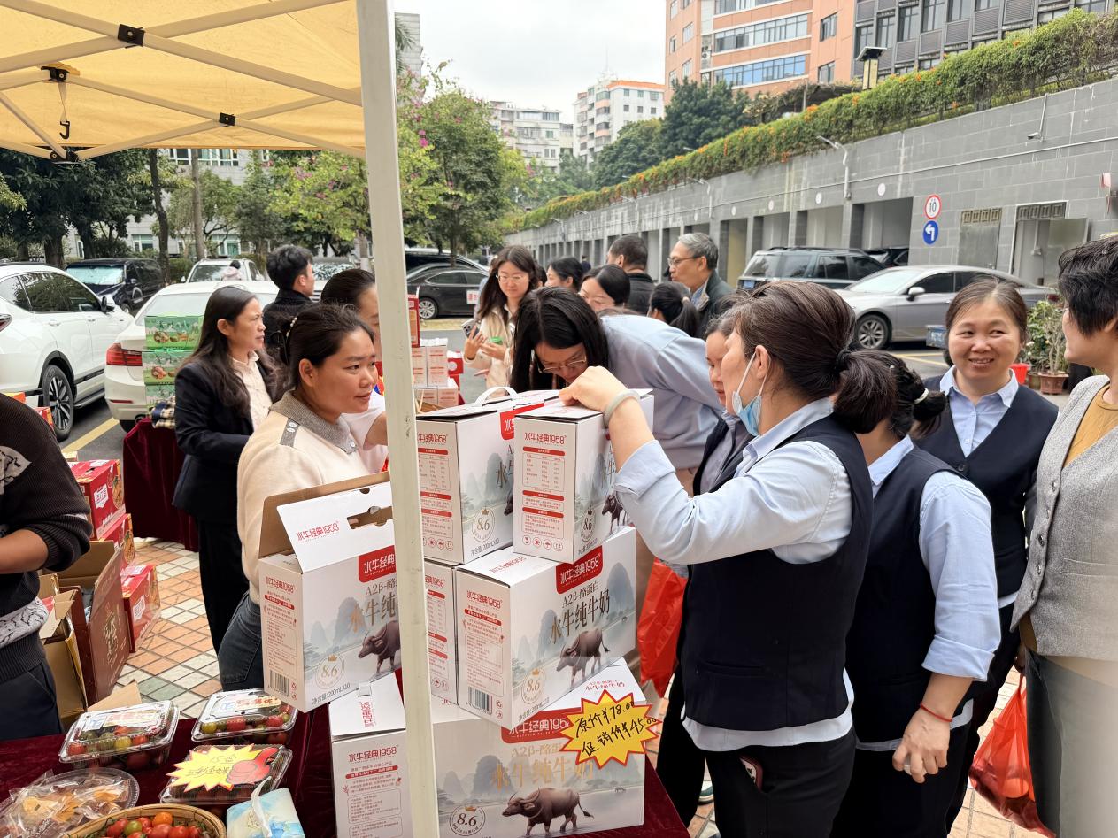 来自广西多个地市及协作县(市、区)的特色农产品集中亮相,为机关干部职工及周边群众提供丰富年货选择,搭建精准产销对接桥梁,推动粤桂协作从“单向帮扶”向“双向赋能”进阶。活动紧扣“沉浸式体验+精准化展销”核心定位,精心设置三大功能区域,全方位提升消费帮扶体验感与实效性。互动打卡引流区兼具趣味性与实用性,不仅为现场营造了浓厚的新春氛围,更同步推出满赠福利,消费达标即赠广西特色农产品让大家在选购中收获双重惊喜,让干部职工在选购年货的同时收获双重惊喜,切实将消费帮扶理念融入日常、深入人心。