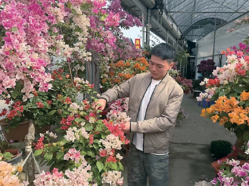 几公里外的长福村也早已被新春的热闹裹挟。沿路两侧是整齐的花卉门店,千态百状的仙人球、色彩缤纷的蝴蝶兰、花团锦簇的三角梅,还有姿态万千的盆景绿植,争奇斗艳。“95后”花商王佳伟是众多商贩中的一员,一边麻利地给盆栽打包、修剪枝叶,一边扯着嗓子招呼往来的顾客,氤氲的花香里满是新春的烟火气。