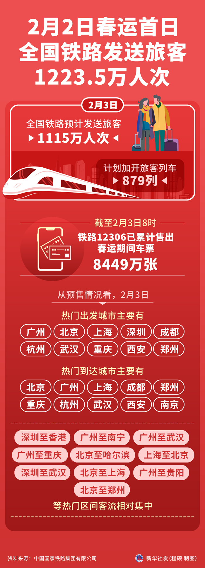 新华社北京2月3日电(记者樊曦)记者从中国国家铁路集团有限公司获悉,2月3日,全国铁路预计发送旅客1115万人次,计划加开旅客列车879列。2月2日,全国铁路发送旅客1223.5万人次,运输安全平稳有序。