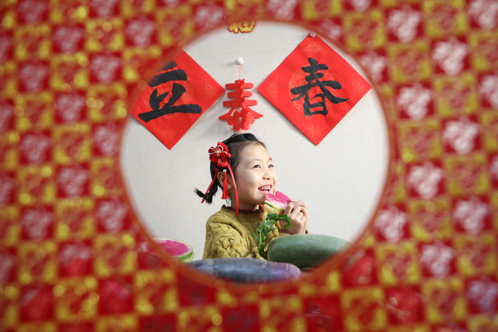 2026年2月3日,在河北省唐山市丰润区太平路街道冀新社区,小朋友在吃萝卜“咬春”。新华社发(朱大勇 摄)