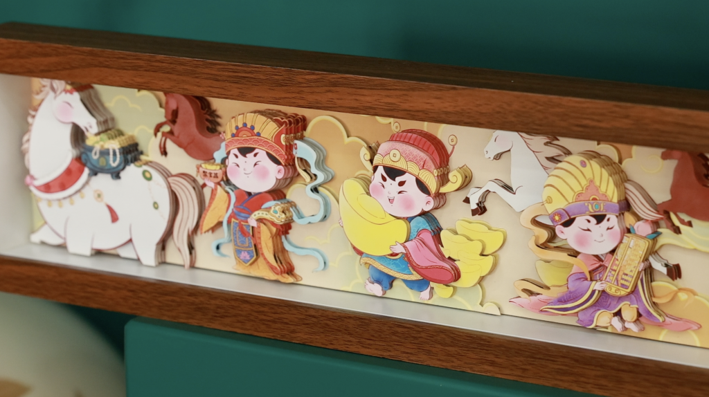 水印工作室内,记者亲手体验年画拓印——颜料均匀涂抹,纸张轻压揭起,马年吉祥图案跃然眼前,传递前程似锦的美好期盼。步入彩绘工作室,经典年画形象“娃娃抱鱼”正被晕染上明快色彩,成为贴合年轻人审美的新潮文创。直播间里,主播们热情推介马年台历、立体纸雕等新品,老字号通过屏幕圈粉年轻消费者。