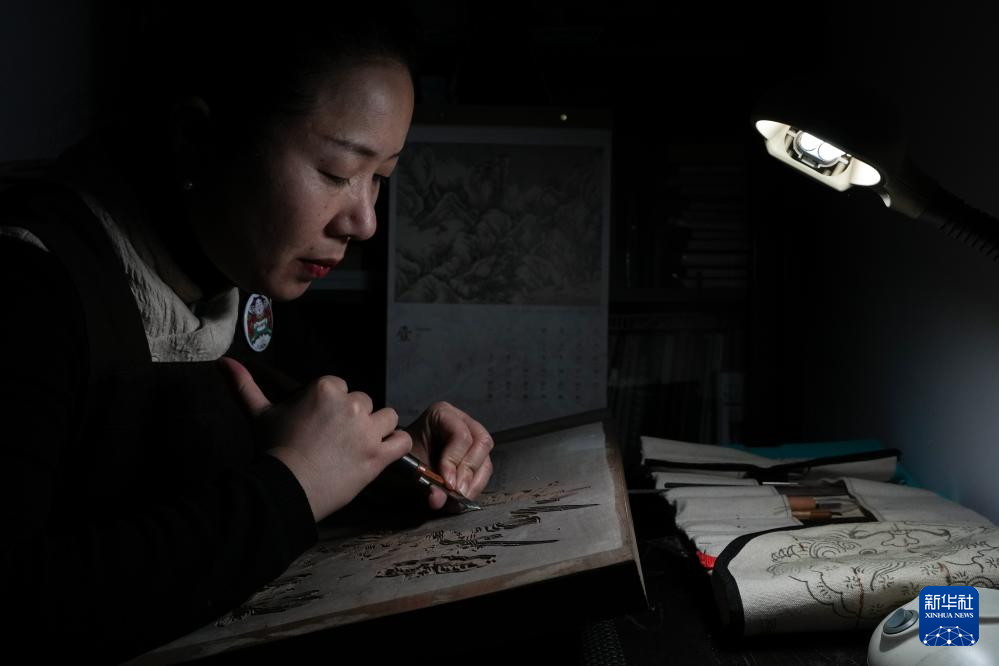 乔兰蓉在工作室里雕版(2月5日摄)。
