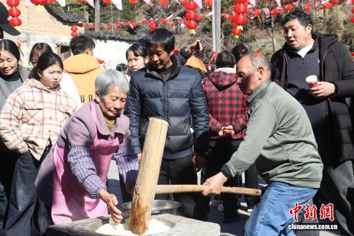 2月8日,2026第九届厦地年味趣游会在屏南县屏城乡厦地村举行,四方游客走进古村赏非遗、寻年味、品古韵。图为打糍粑。中新网记者 叶茂 摄
