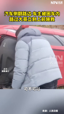 汽车侧翻路边,车主被困车内,路过大哥立刻上前施救。…