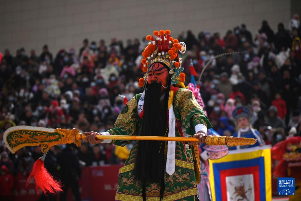 2月10日,在甘肃省敦煌市国际会展中心广场“敦煌古韵 骏马舞潮”春节社火汇演活动现场,人们观看社火表演。