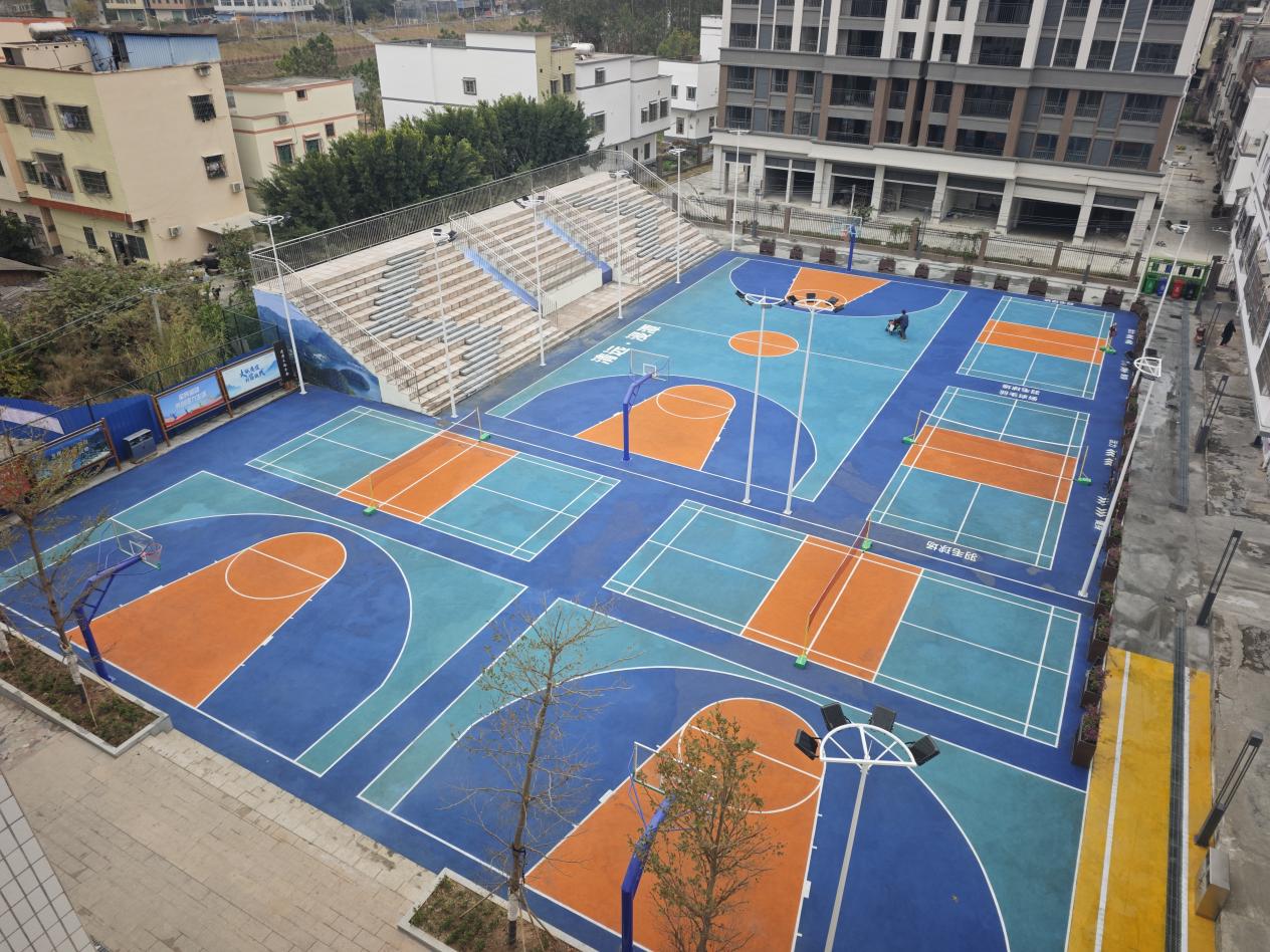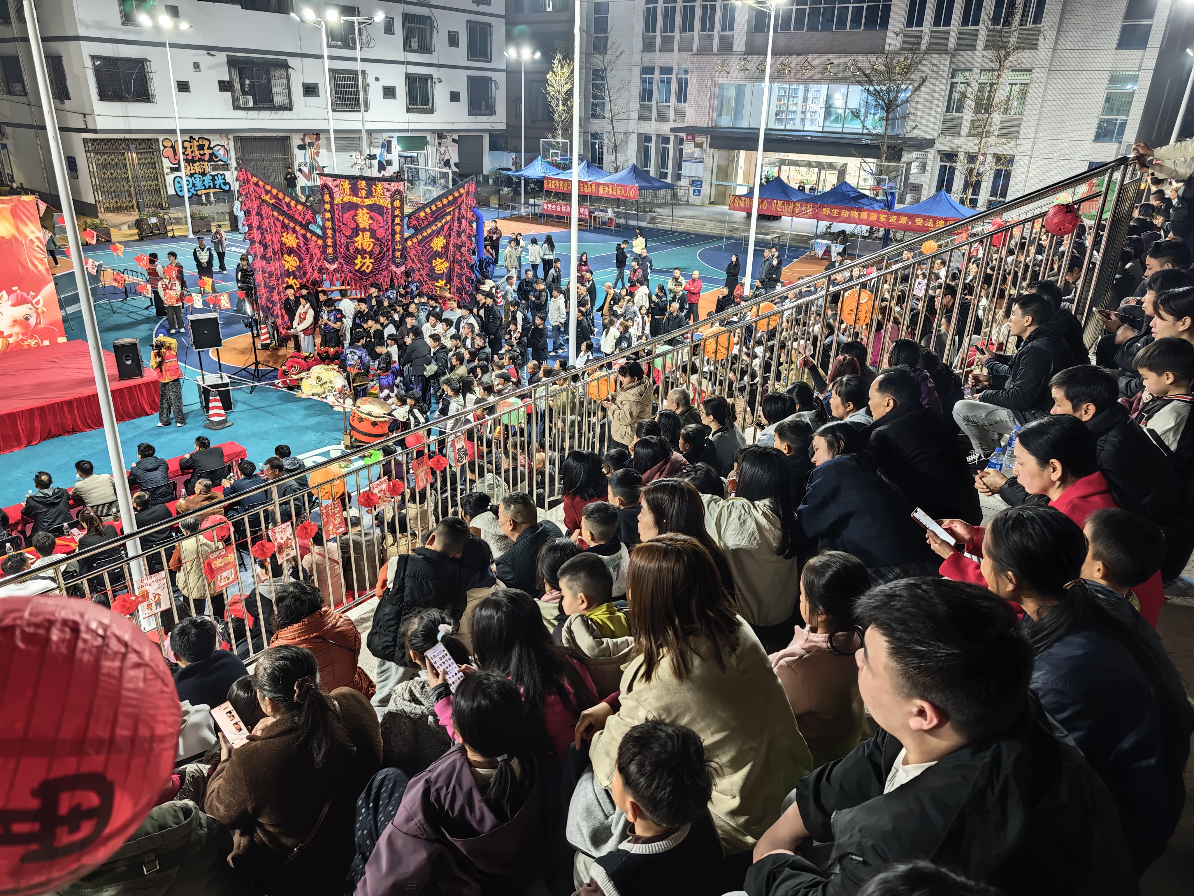 户外的文化广场则在重修篮球场、羽毛球场、乒乓球场等的基础上,增建了阶梯观众台,正好为此次春晚活动提供了优质、便利、舒适的观演场地。