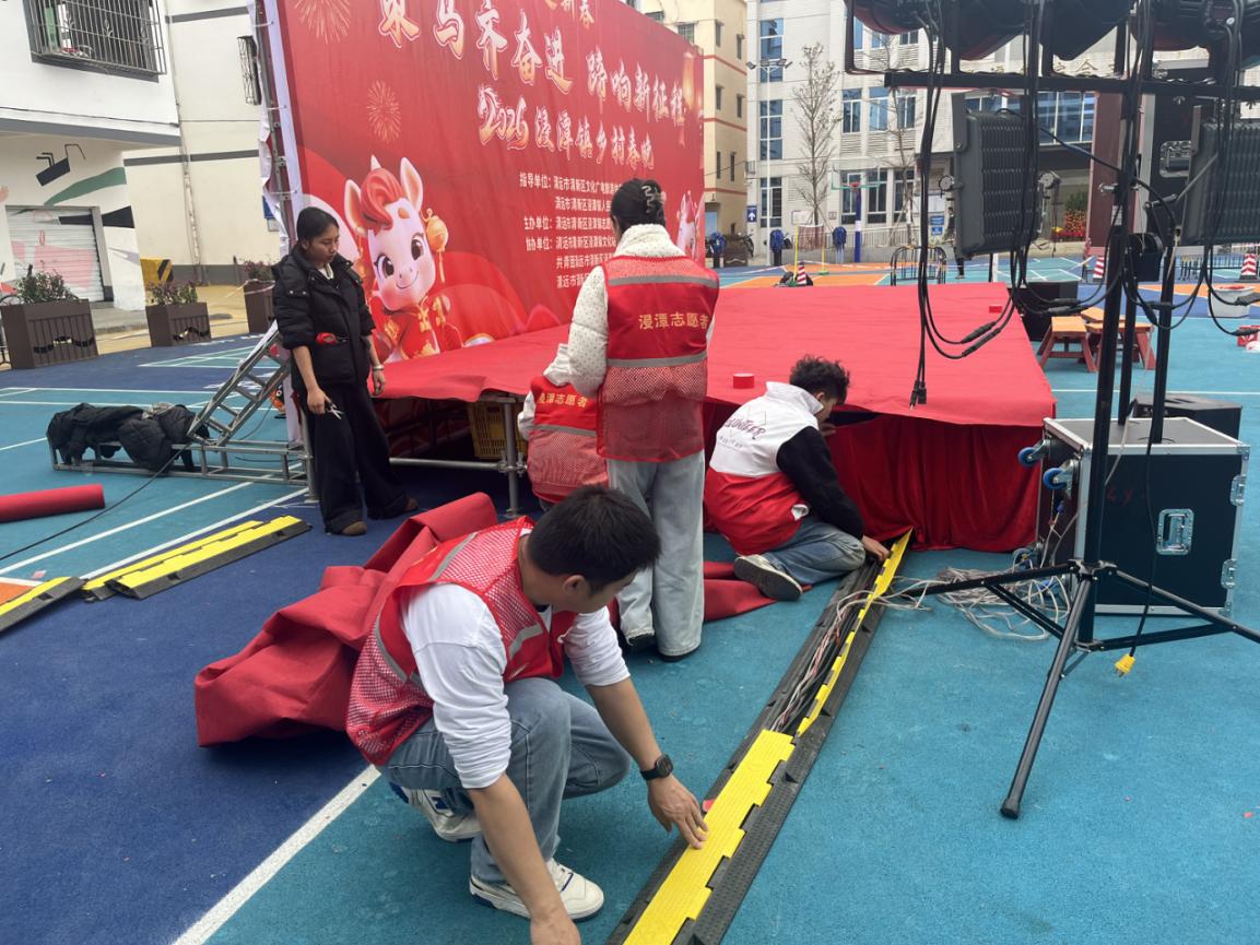 志愿者们开展晚会场地布置、舞台搭建工作。