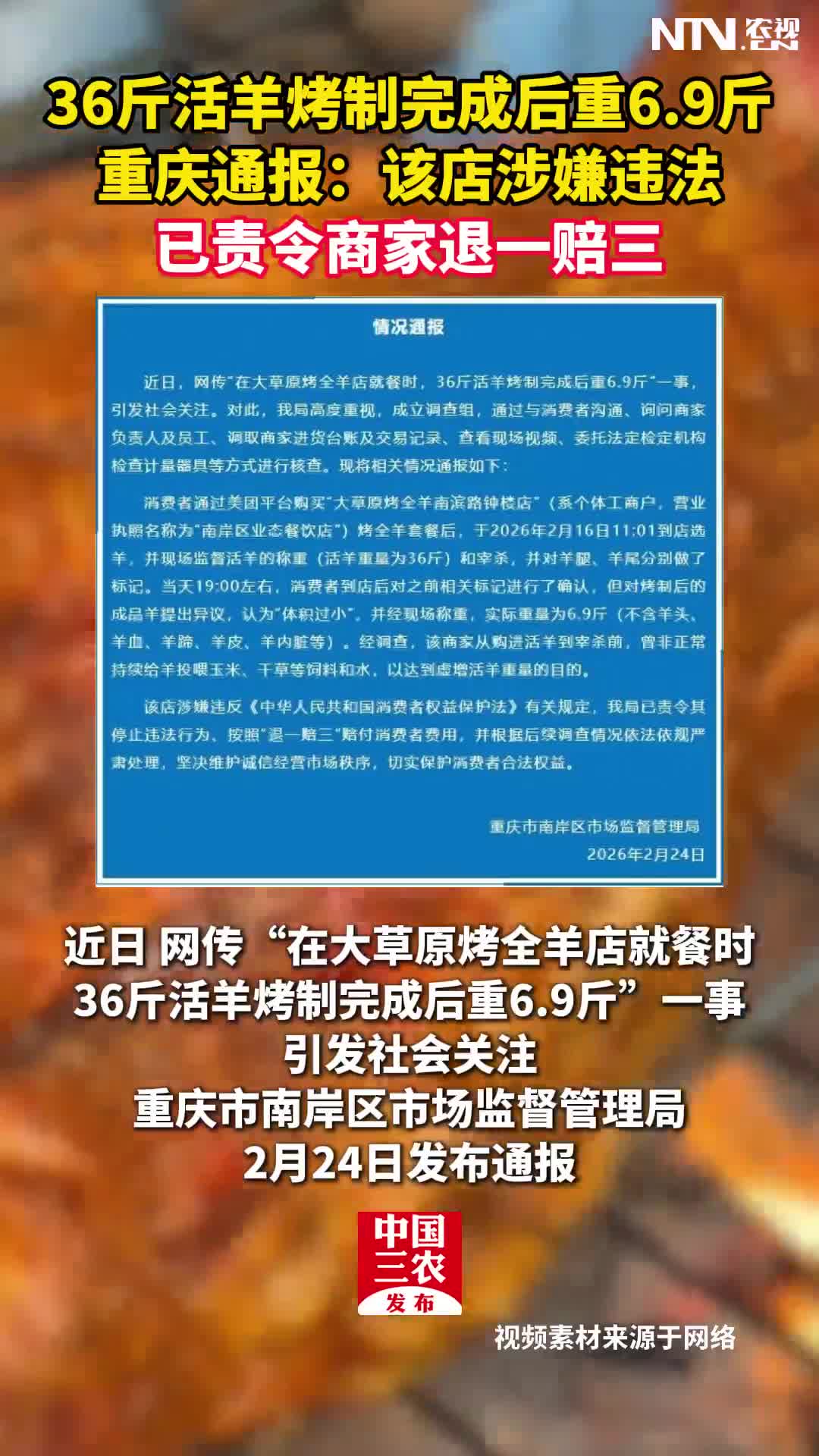 36斤活羊烤制完成后重6.9斤 重庆通报:该店涉嫌…