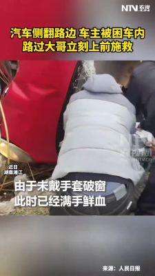 汽车侧翻路边,车主被困车内,路过大哥立刻上前施救。