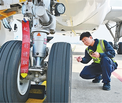 海南省海口市,美兰国际机场,工程师进行飞机航前检查。