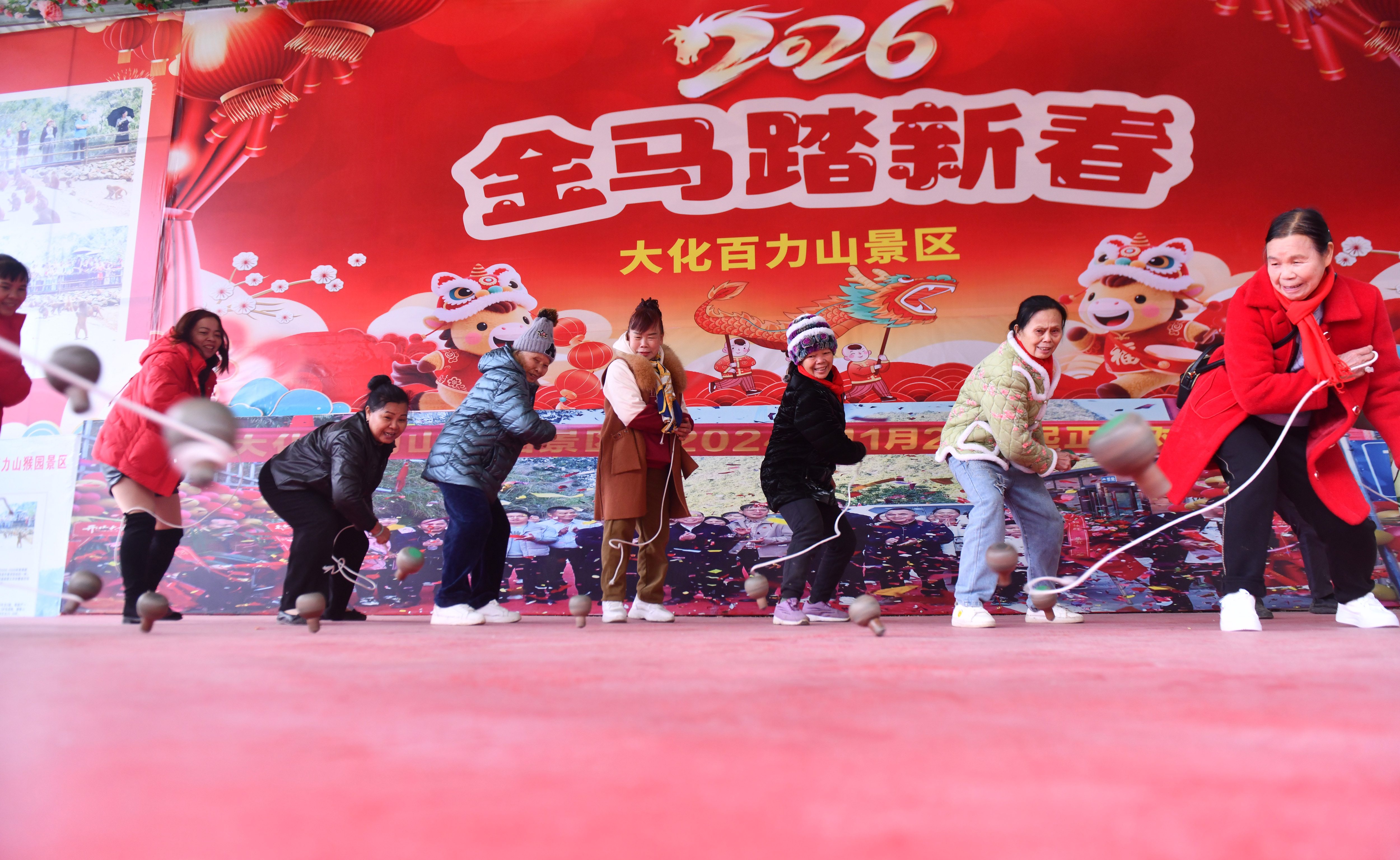 2026年2月17日,广西河池市大化瑶族自治县大化镇仁良村在该村百力山猴园景区举办迎新春陀螺比赛,各族群众以陀会友,欢度新春。
