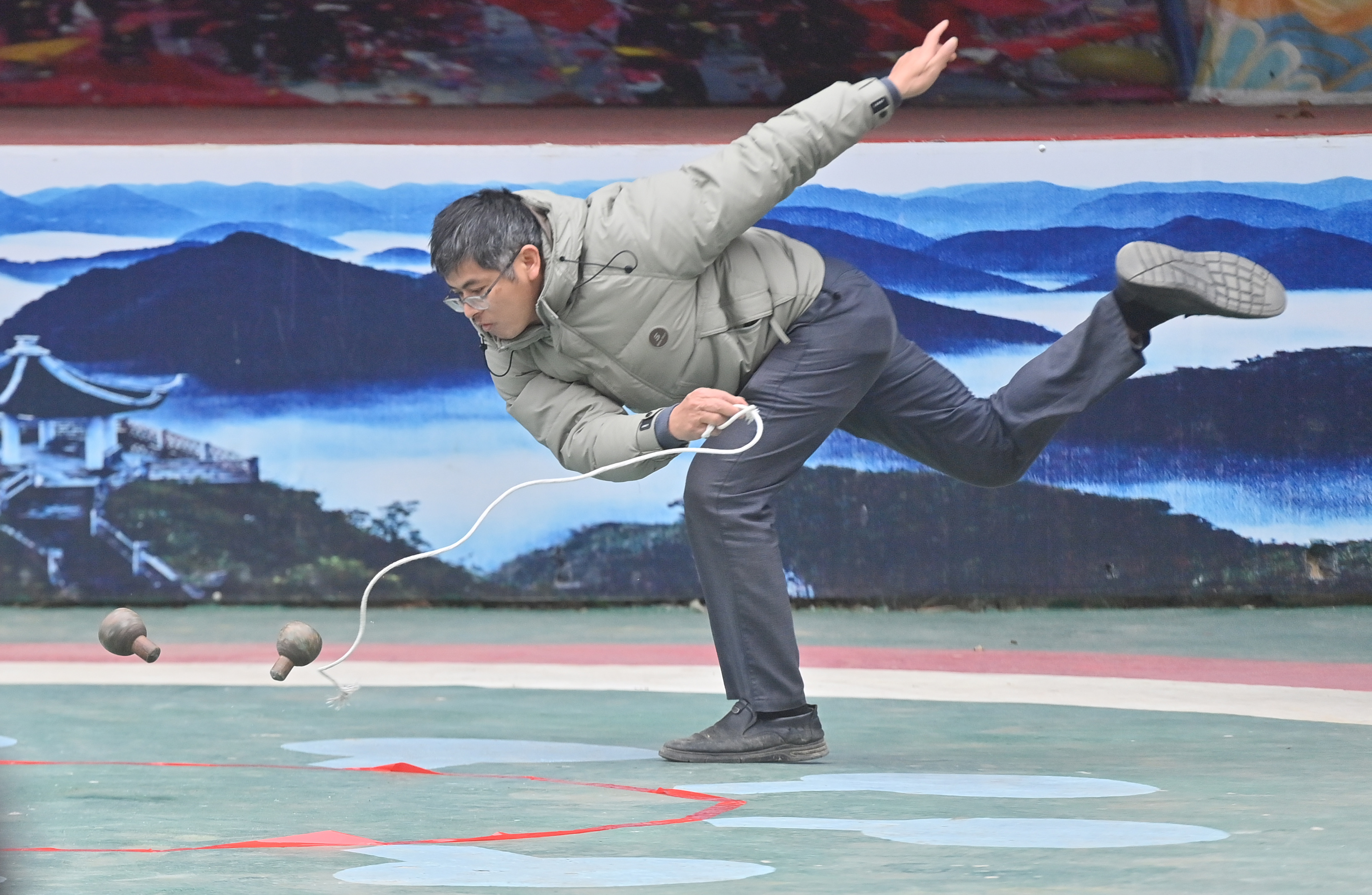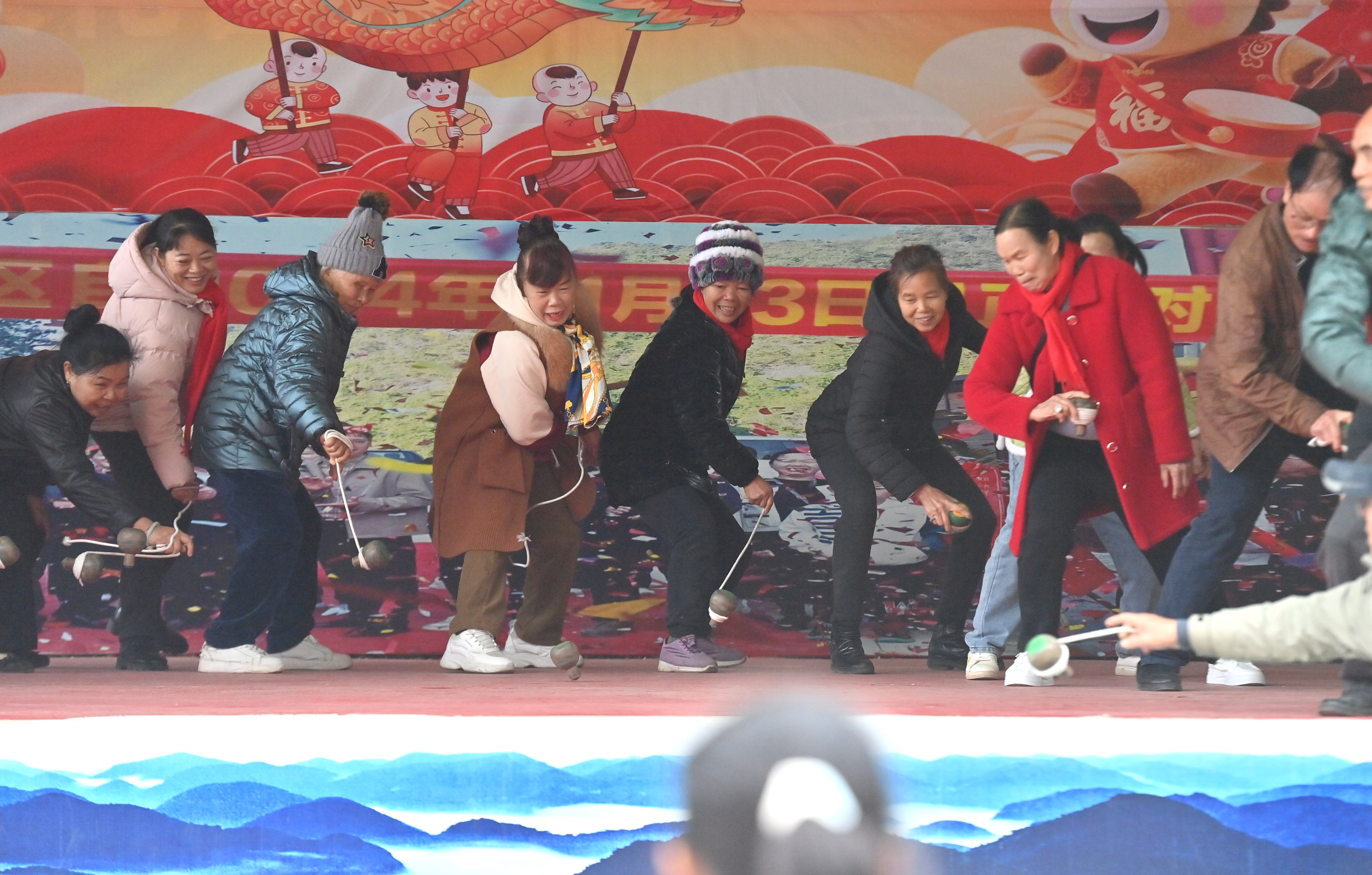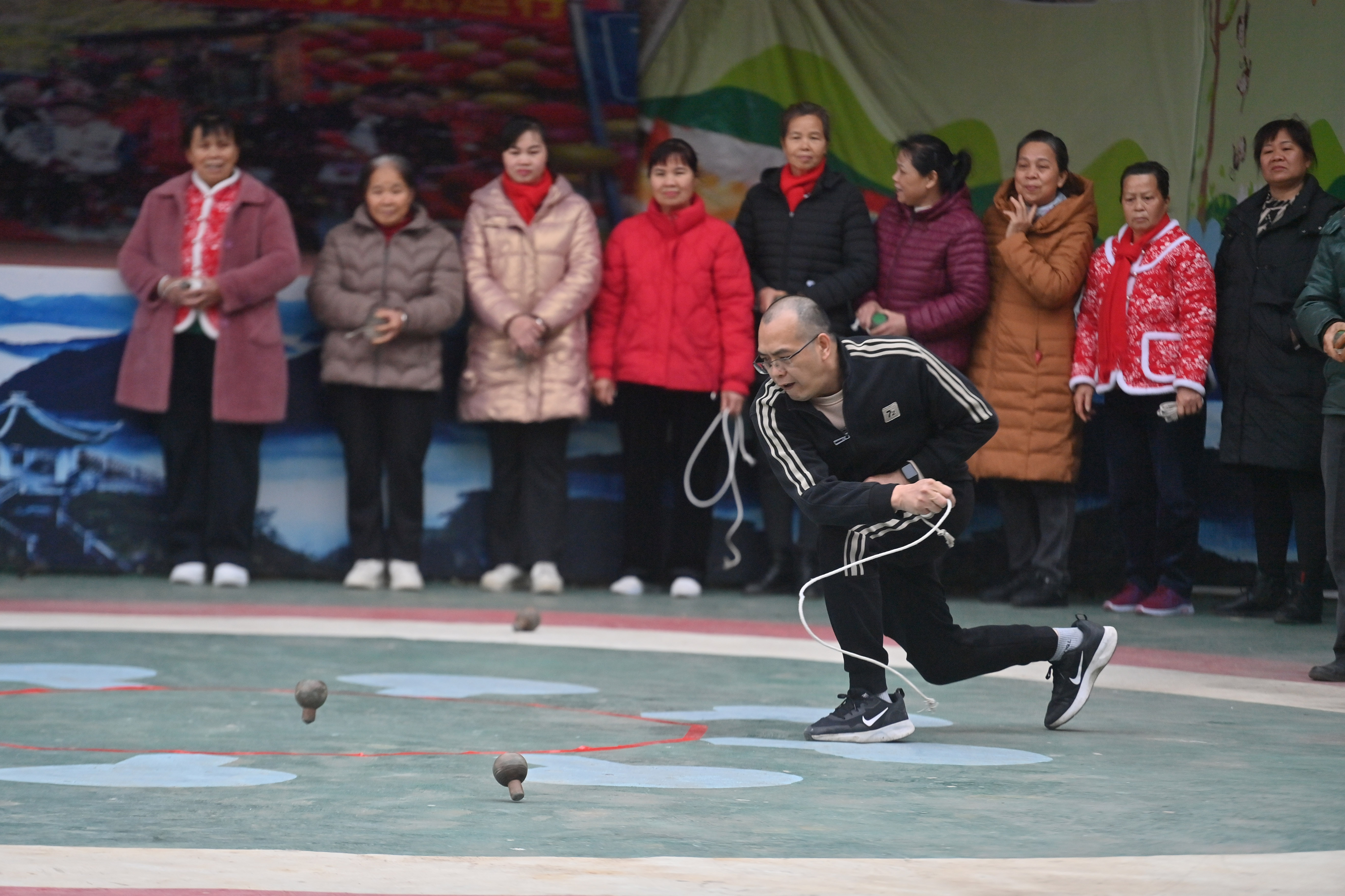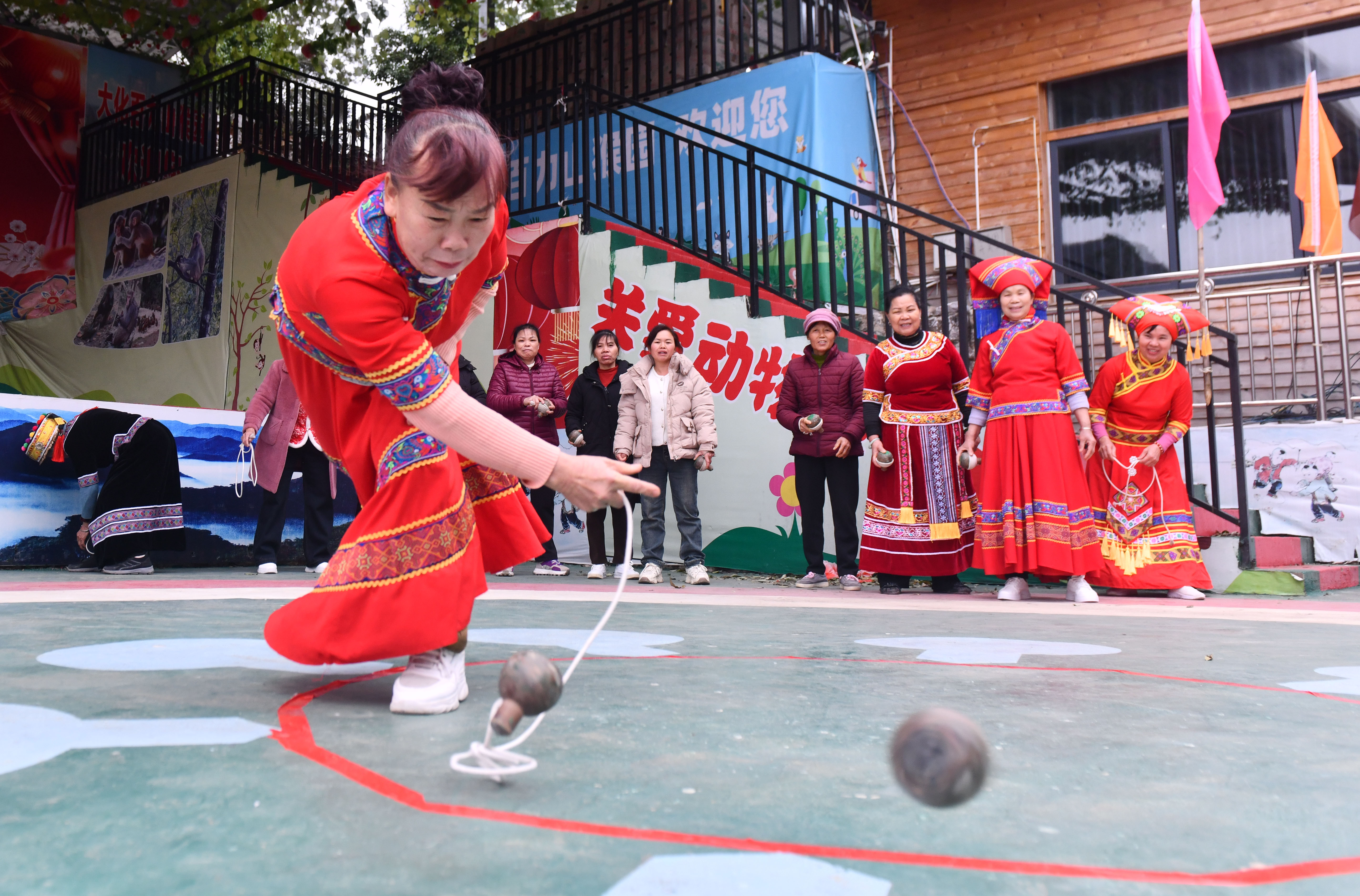 2月17日,广西河池市大化瑶族自治县大化镇仁良村百力山猴园景区,村民在陀螺比赛中。