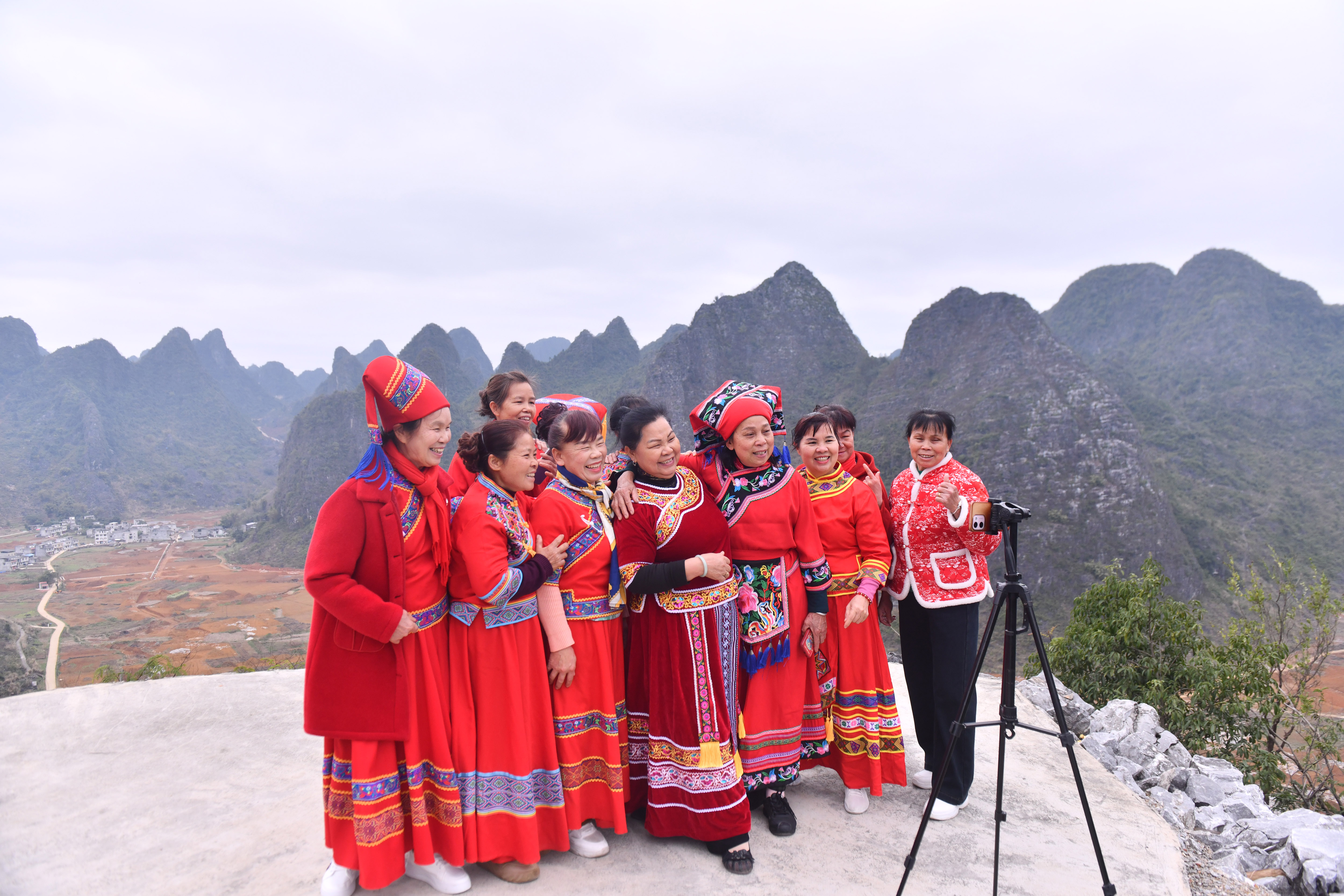 2月17日,广西河池市大化瑶族自治县大化镇仁良村百力山猴园景区,村民在展示比赛奖品。