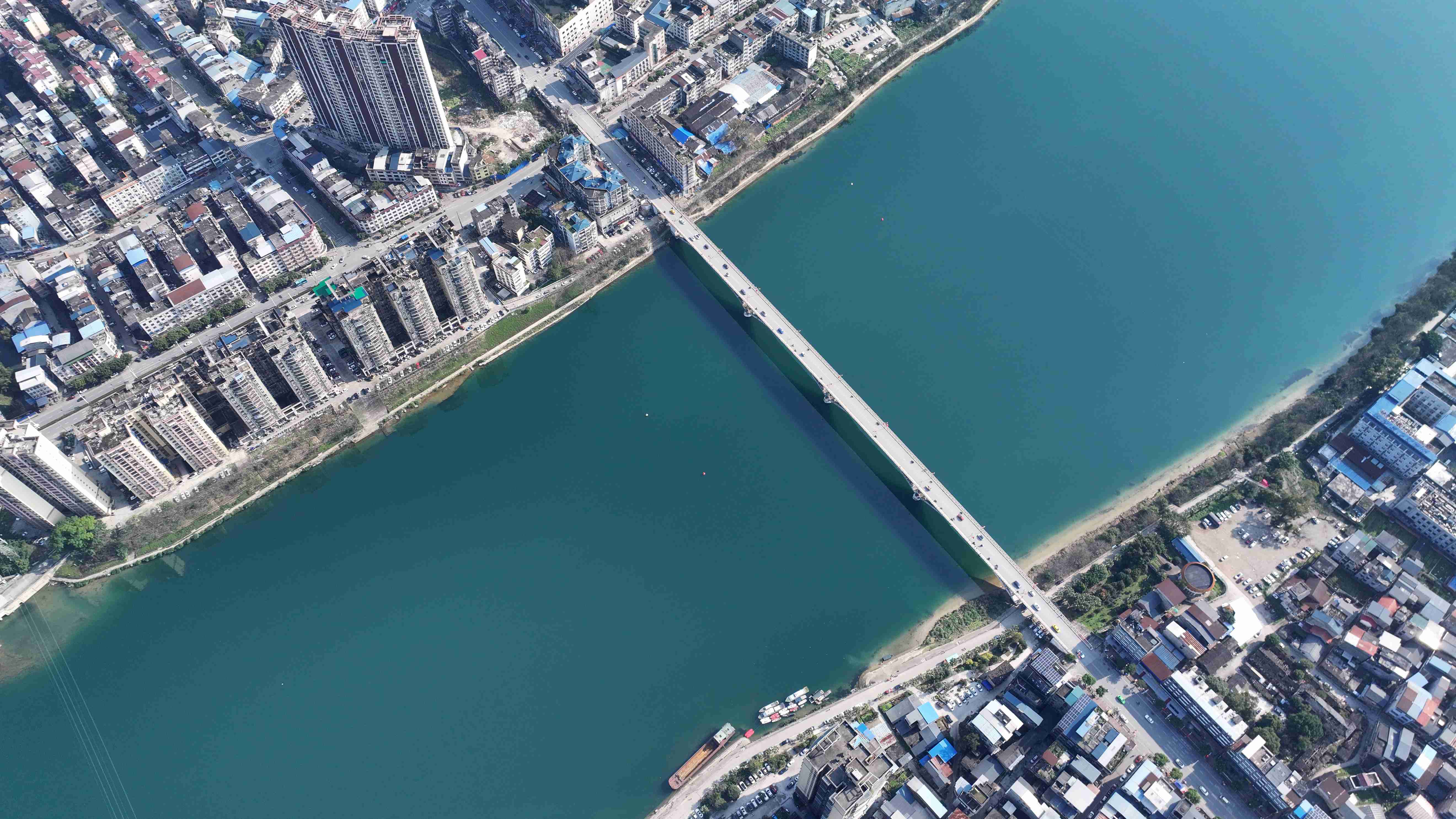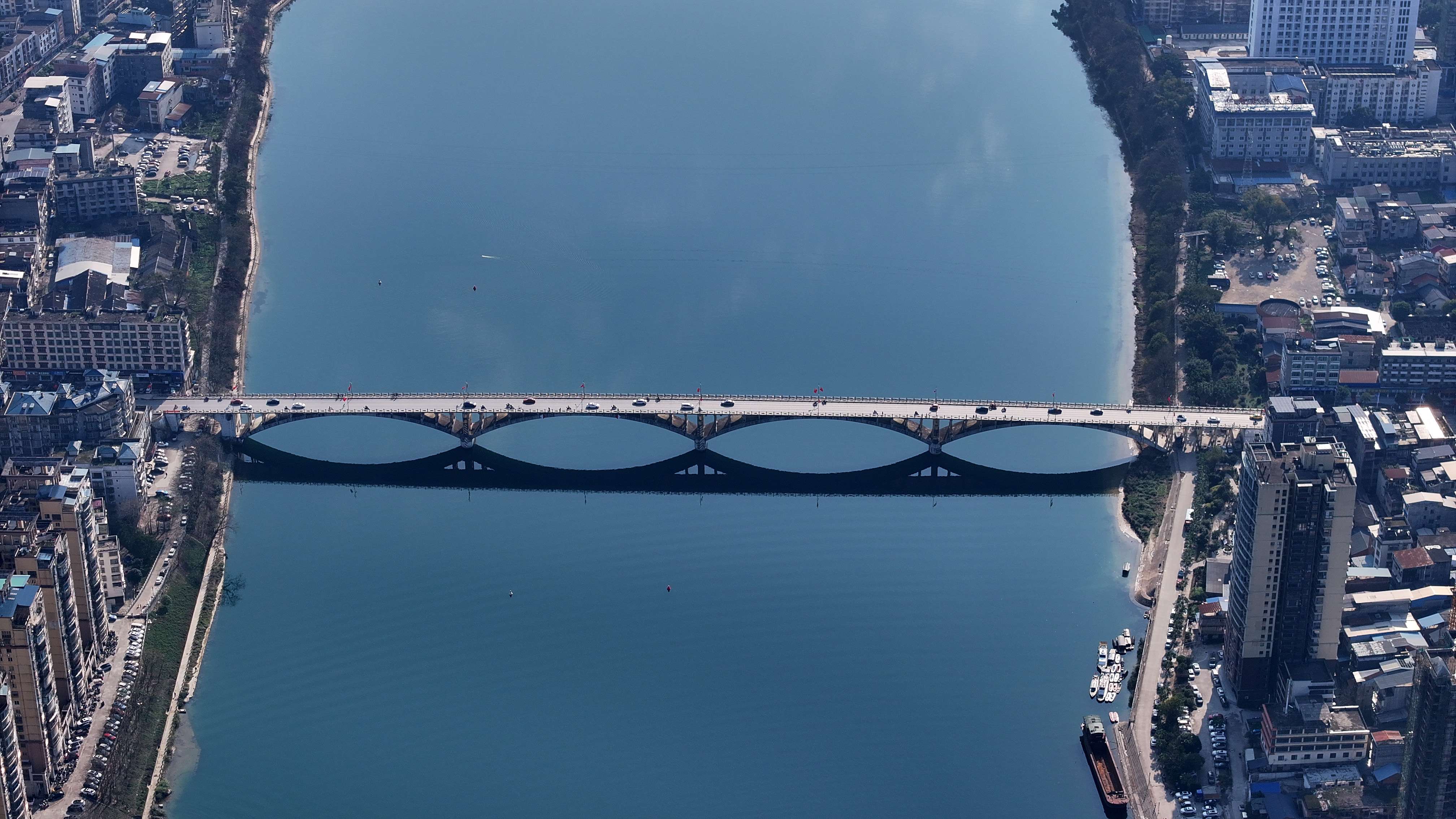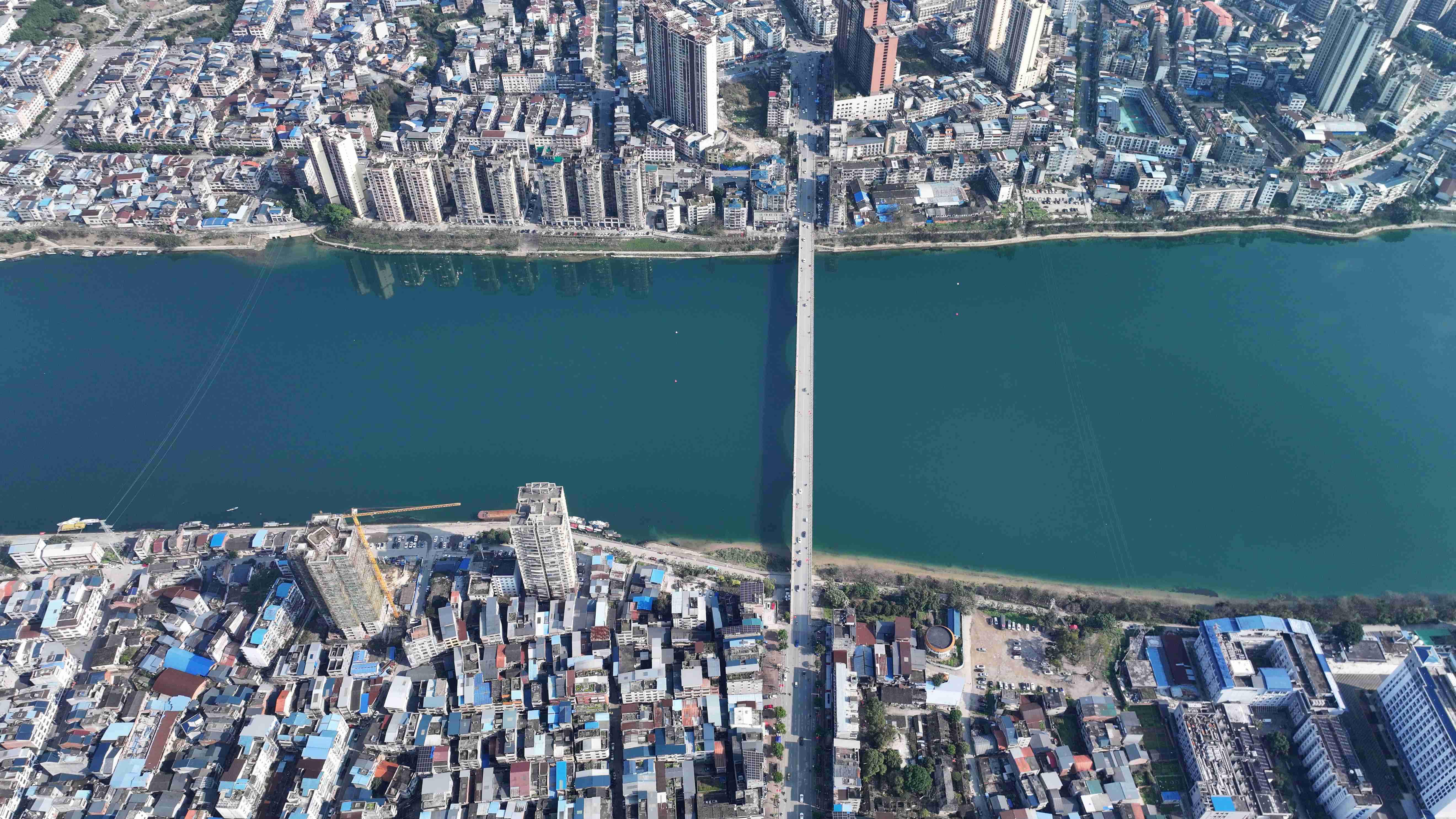 2026年2月20日,珠江上游融江广西柳州市融安县城段天蓝水碧,美如画卷(无人机照片,谭凯兴 摄)。
