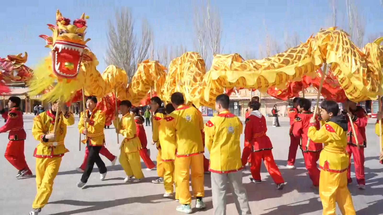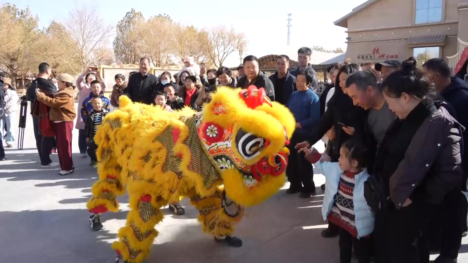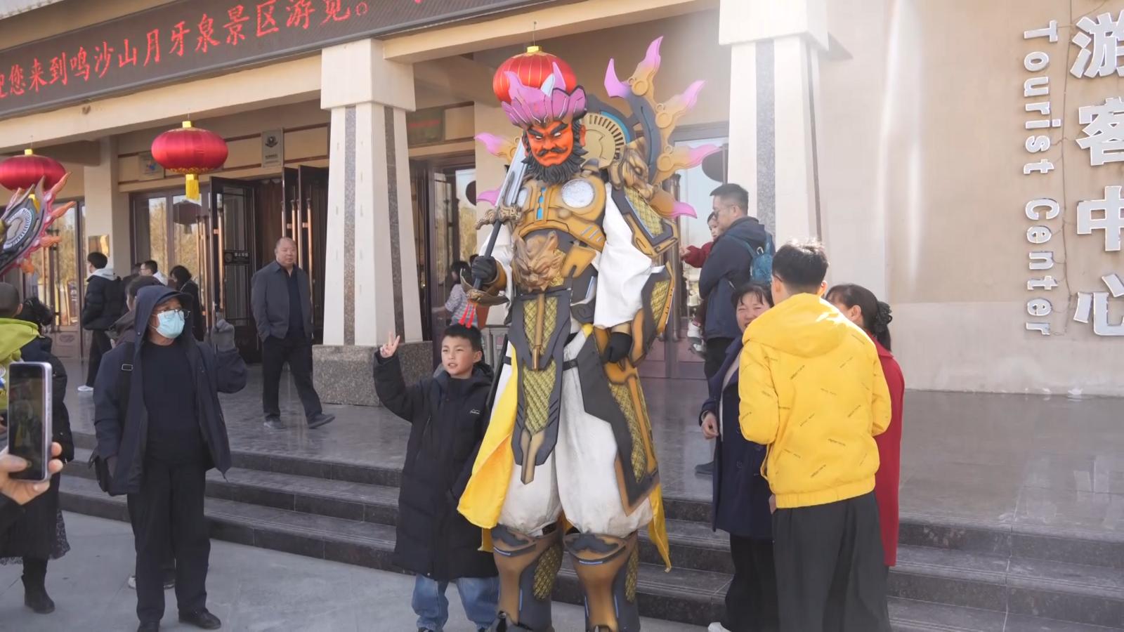 记者在景区看到,蓝天映金沙,月泉嵌大漠,丝路风情与新春年味交融,喜庆氛围拉满。景区不仅推出了热闹非凡的民俗展演,更以诚意满满的惠民举措和沉浸式互动体验,喜迎八方宾客。刚踏入景区,铿锵的锣鼓声便扑面而来,一场融合了敦煌元素的社火迎宾正在上演。舞龙舞狮队腾挪跳跃,气势十足,将新春的喜庆氛围瞬间点燃,让游客沉浸式感受西北传统年俗的独特魅力。