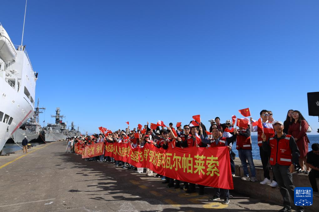 3月1日,执行“和谐使命-2025”任务的中国海军“丝路方舟”号医院船抵达智利瓦尔帕莱索港,民众在码头欢迎。新华社发(崔晓洋摄)