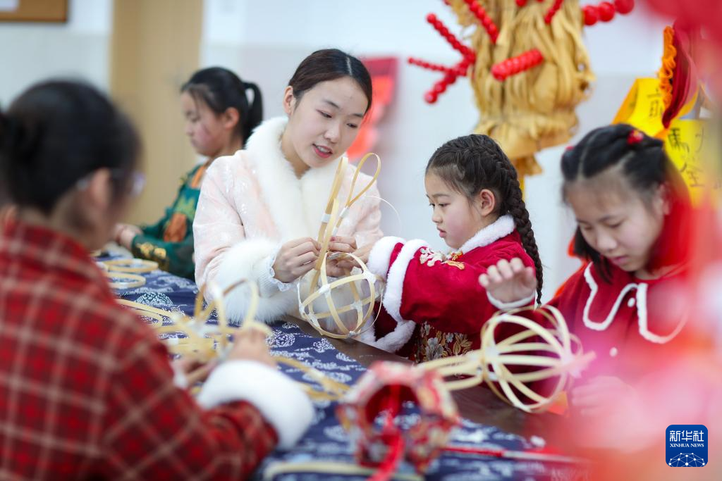 3月3日,居民在江苏省泰州市姜堰区三水街道庆元宵活动中制作手工花灯。