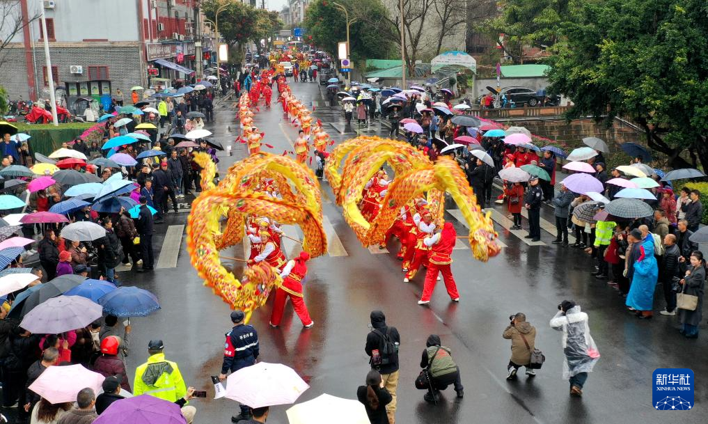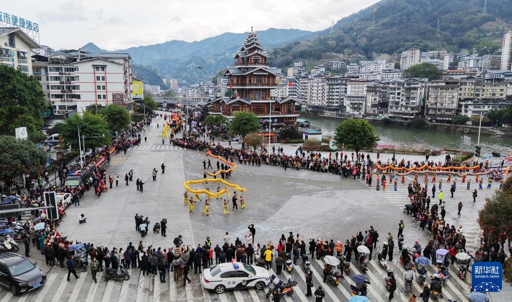 3月3日,在广西龙胜各族自治县县城,舞龙舞狮队巡游展演(无人机照片)。