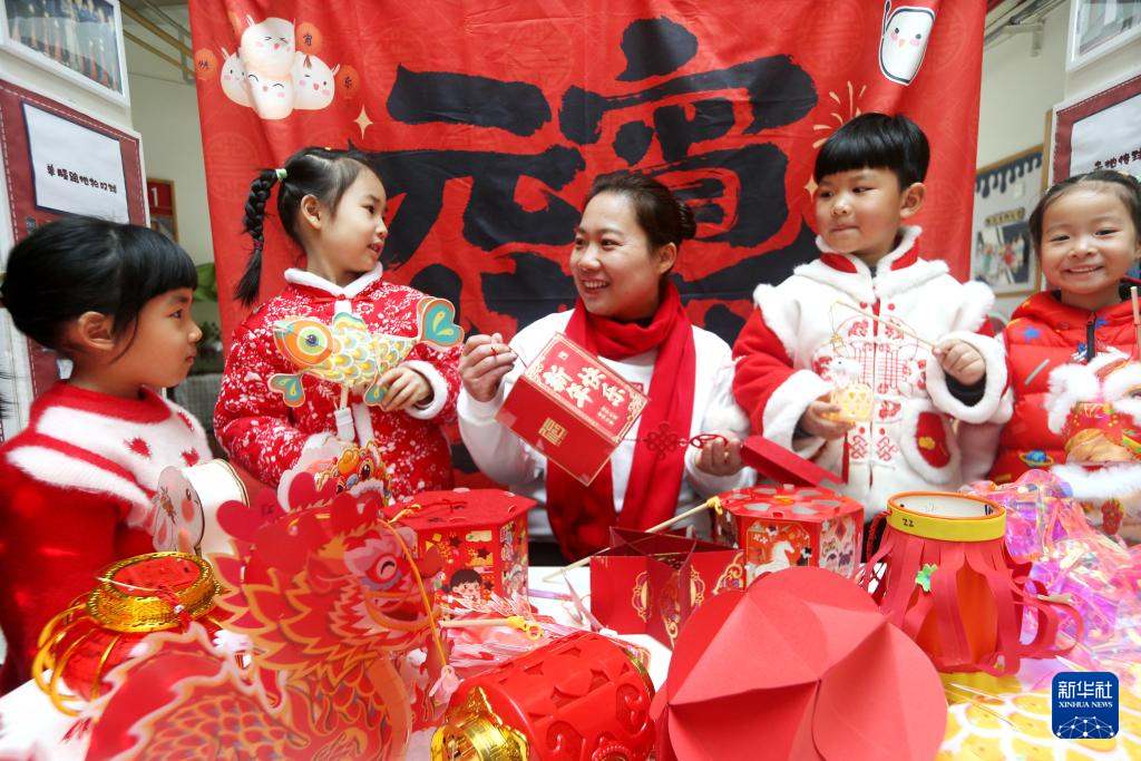 3月3日,在江苏省连云港市钟声和谐幼儿园,老师教小朋友制作元宵花灯。