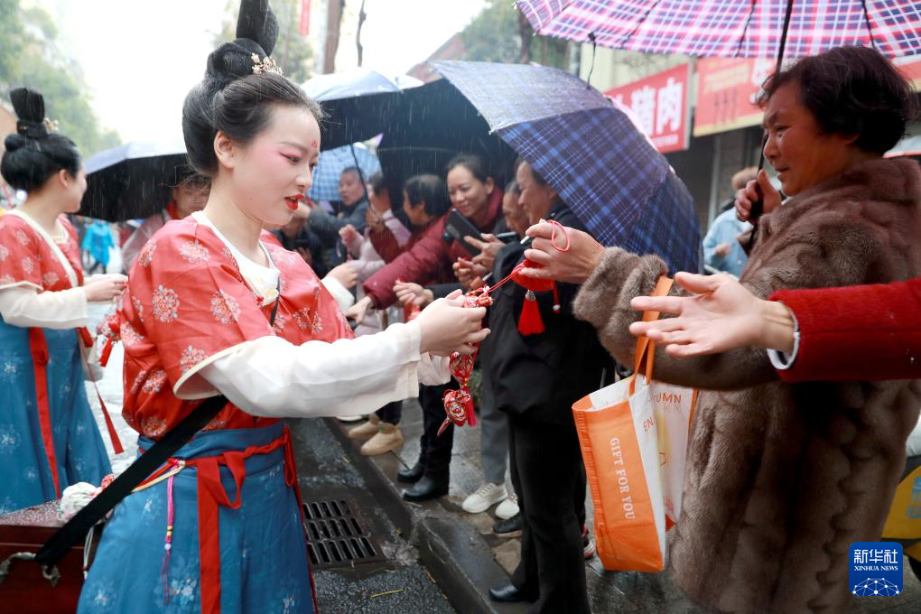 3月3日,演员在四川省泸州市纳溪区闹元宵巡游活动中向游客赠送香囊。