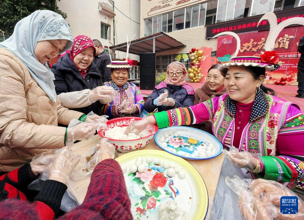 3月3日,四川省绵阳市平武县报恩寺社区居民围坐一起包汤圆。