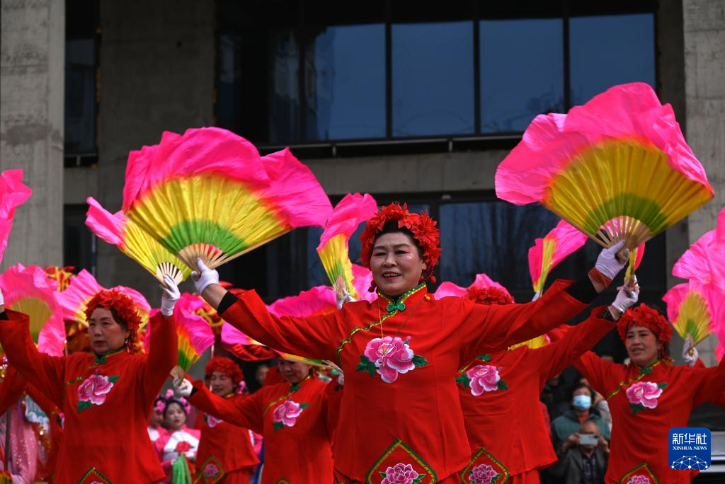 3月3日,秧歌队员在黑龙江省富锦市秧歌汇演现场表演。