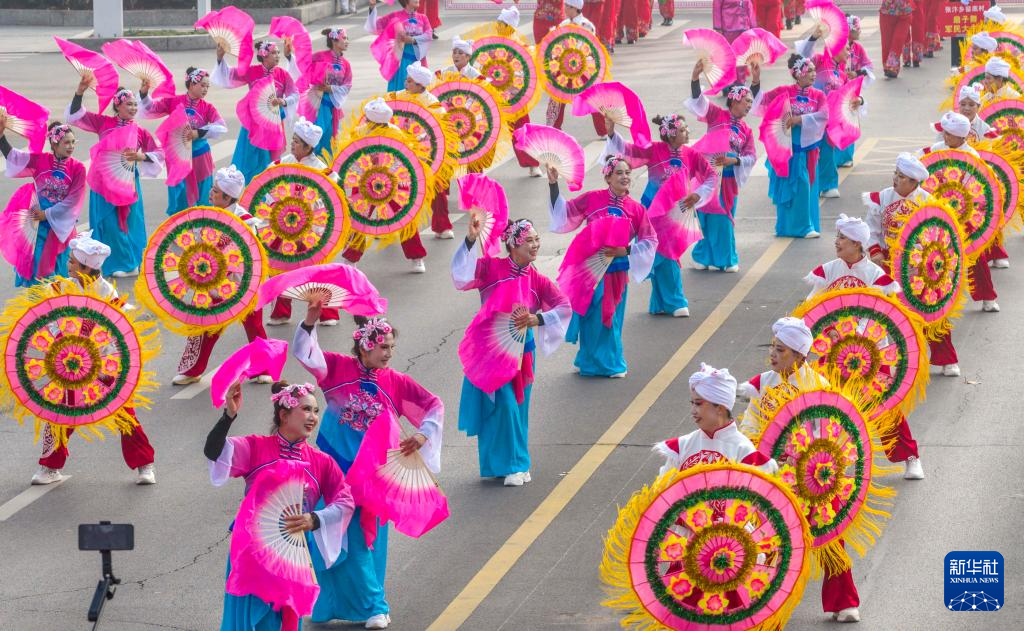 3月3日,人们在河南省三门峡市陕州区陕州大道表演扭秧歌(无人机照片)。