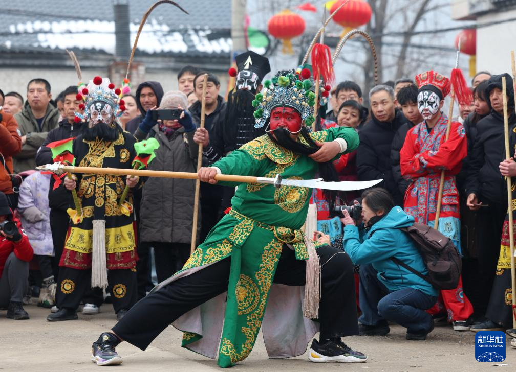 3月3日,民俗艺人在河北省井陉县小作镇桃林坪村为群众表演桃林坪花脸社火。