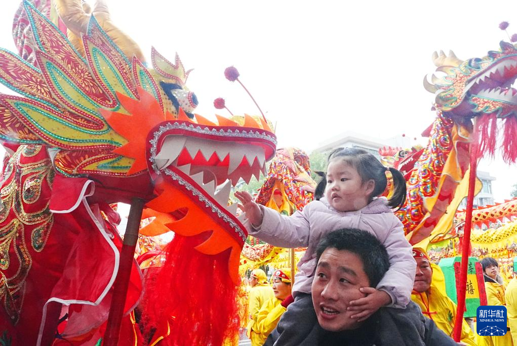 3月3日,一名小朋友在湖南省衡阳市衡山县人民广场舞龙舞狮巡游展演活动中触摸龙头。