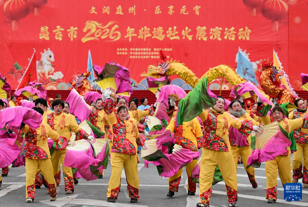 3月3日,以“文润庭州·乐享元宵”为主题的新疆昌吉市非遗社火展演活动在昌吉市启幕,为各族群众送上节日祝福。这是社火队员在表演。
