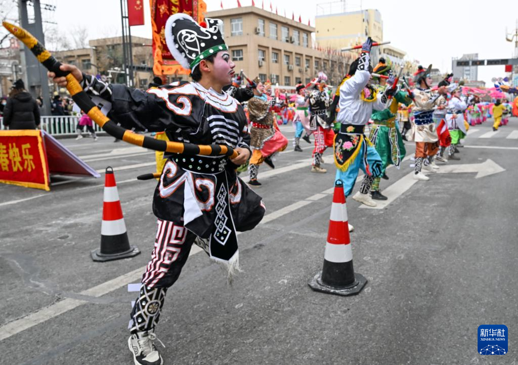 3月3日,社火队员在甘肃省临夏回族自治州永靖县太极镇大川村表演。