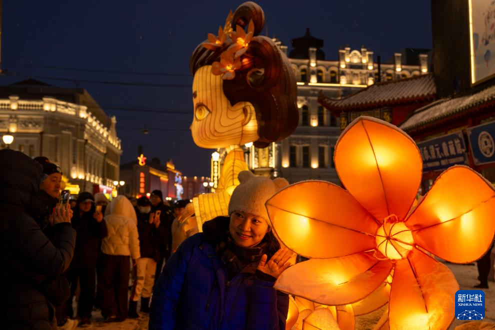 3月3日,游客在哈尔滨中华巴洛克历史文化街区欣赏花灯。