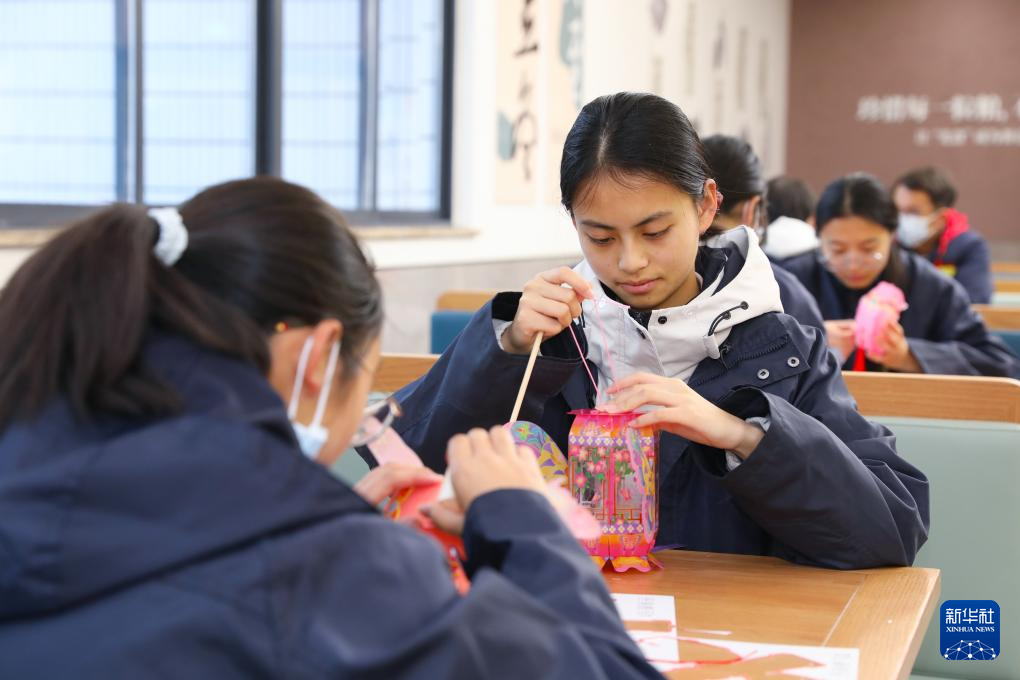 3月3日,彝族交流学生杨畅(左二)在江苏省海安高级中学元宵节活动上制作花灯。