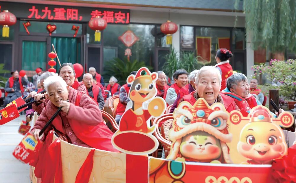 在河南省武陟县木城街道木城养老院,老人们参加 “重阳节趣味划船”活动。图源:新华社