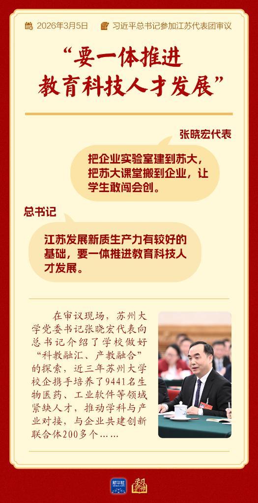 张晓宏代表来自苏州大学,向总书记介绍了学校推进“科教融汇、产教融合”的探索:“把企业实验室建到苏大,把苏大课堂搬到企业,让学生敢闯会创。”近三年校企携手培养了9441名生物医药、工业软件等领域紧缺人才,推动学科与产业对接,与企业共建创新联合体200多个……