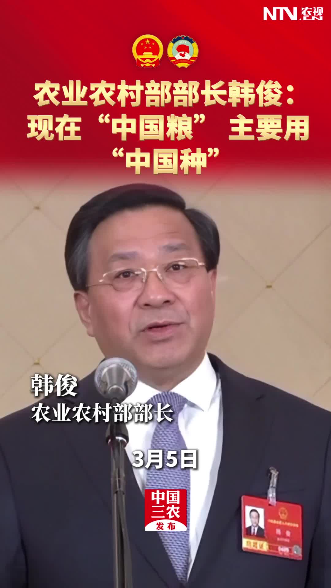 农业农村部部长韩俊:现在“中国粮”主要用“中国种”