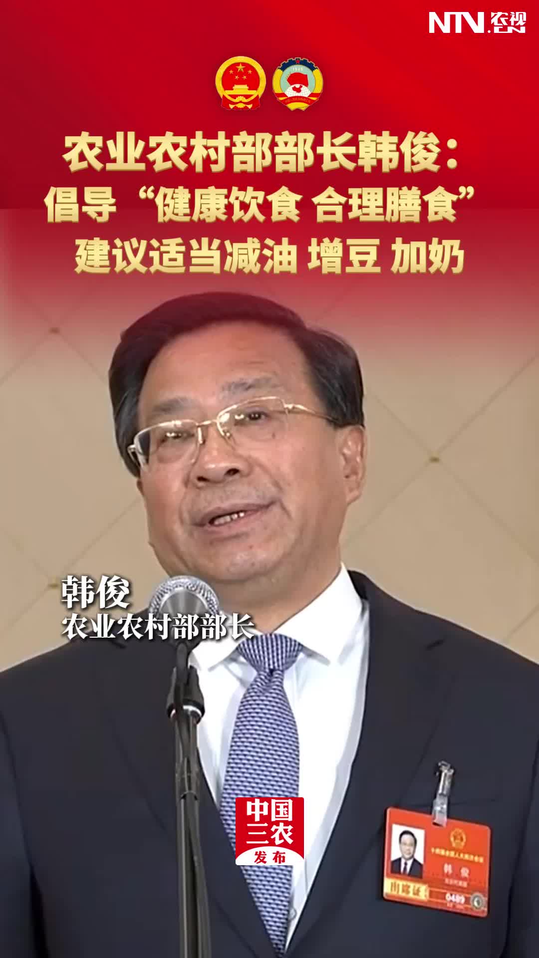 农业农村部部长韩俊:倡导“健康饮食 合理膳食” 建…