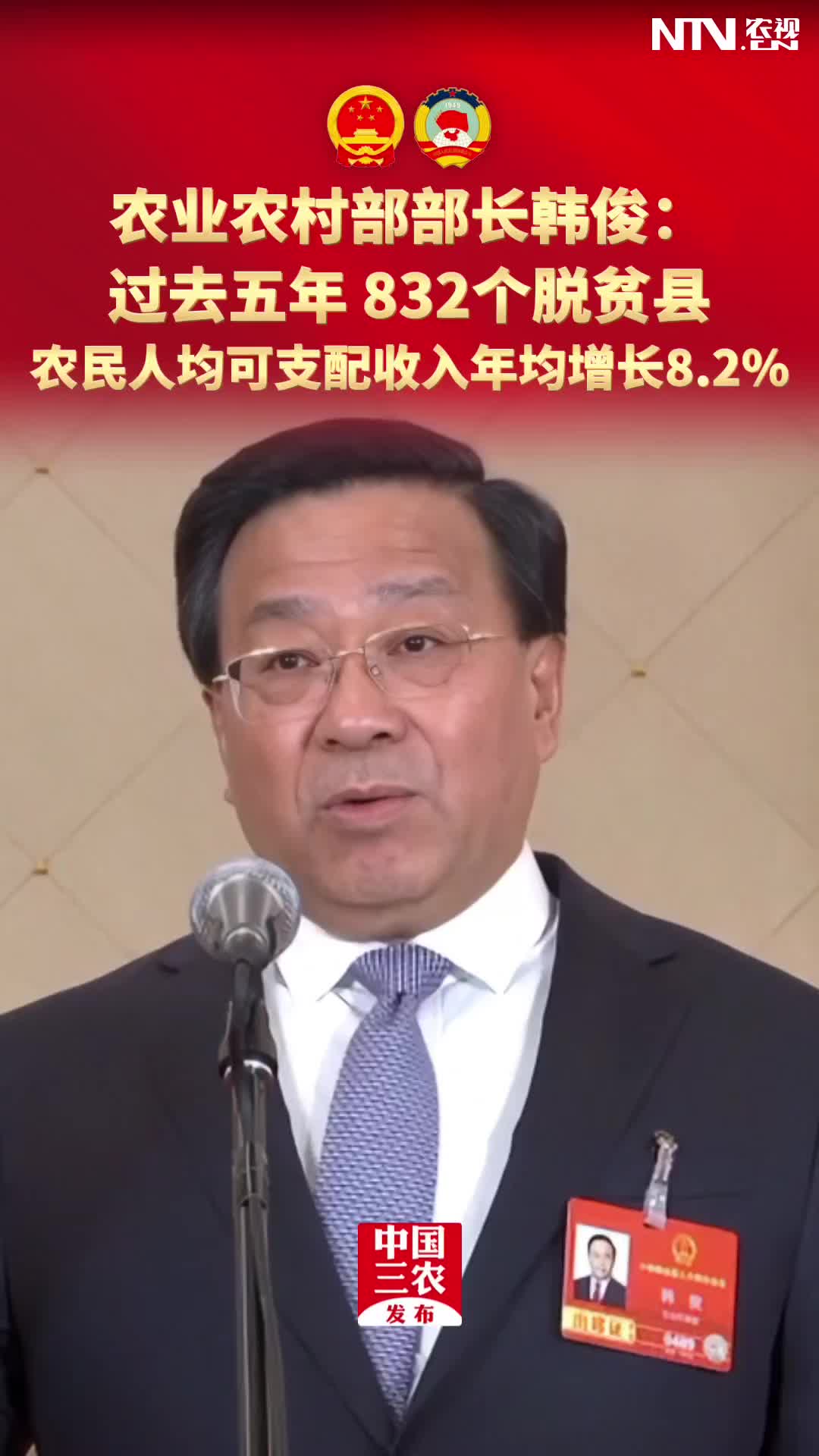 农业农村部部长韩俊:过去五年 832个脱贫县 农民…