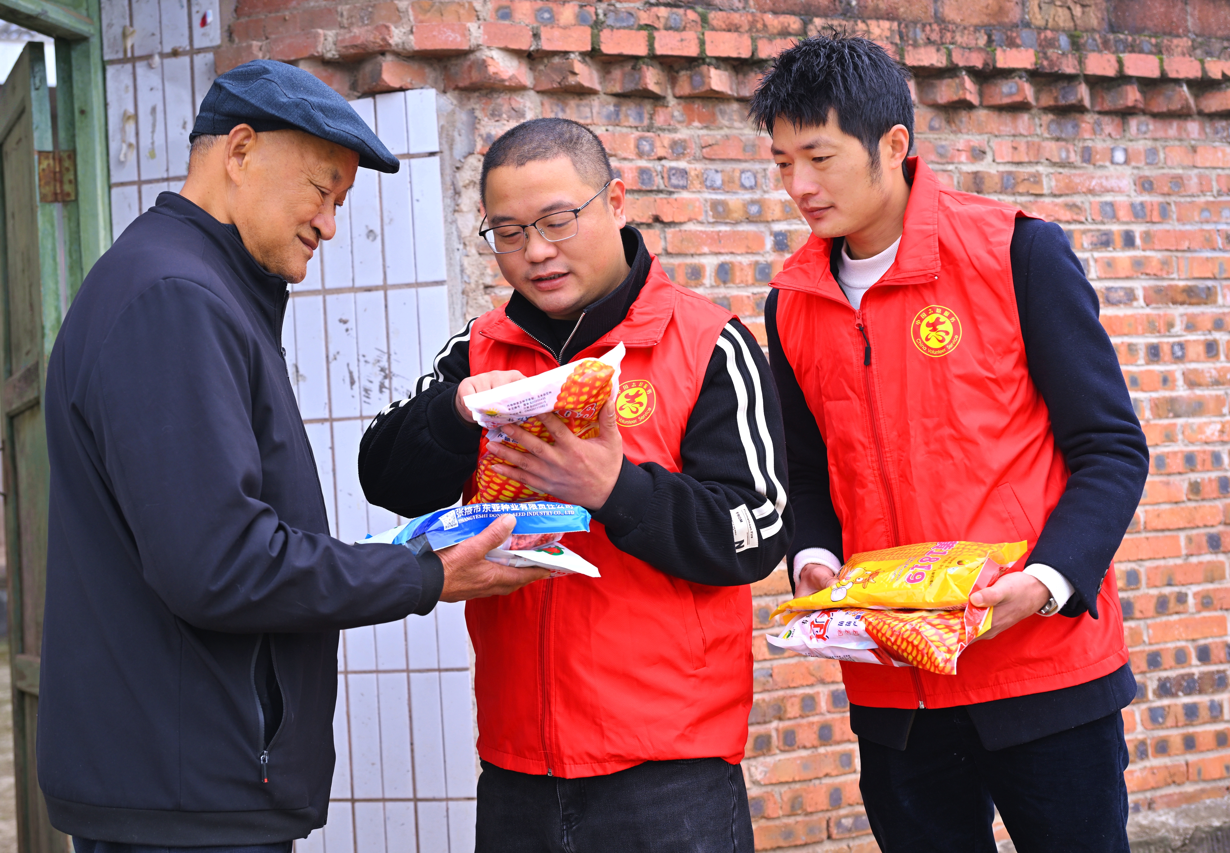 3月4日,在四川省眉山市仁寿县彰加镇德意村,镇村党员干部正在上门为缺劳户送代购的种子。