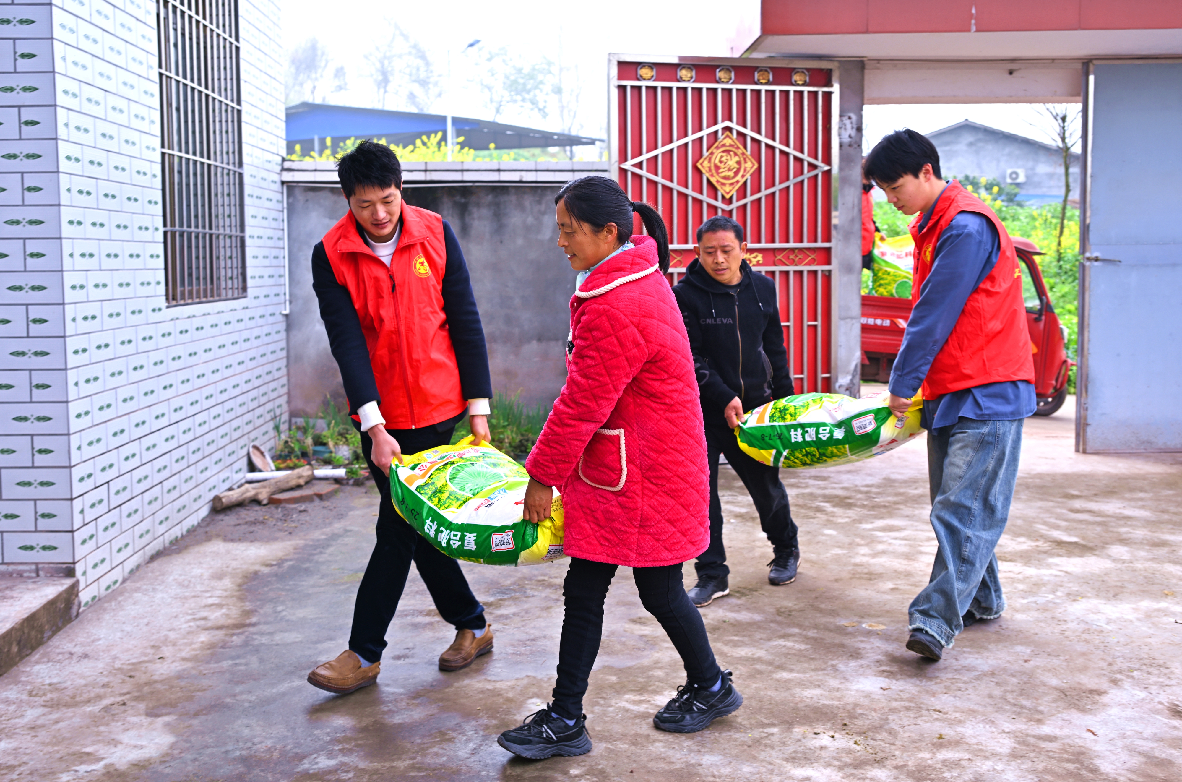 3月4日,在四川省眉山市仁寿县彰加镇德意村,镇村党员干部正在上门为缺劳户送代购的化肥。