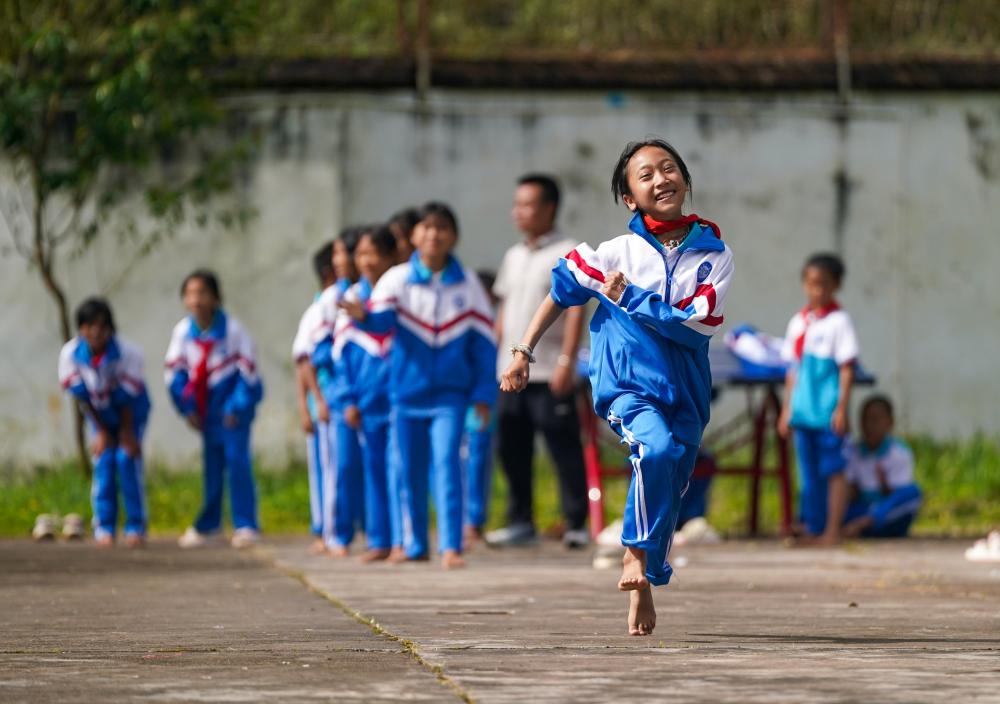 在云南省普洱市孟连傣族拉祜族佤族自治县,腊福小学学生课间在操场进行奔跑接力比赛(2025年9月15日摄)。新华社记者 陈欣波 摄
