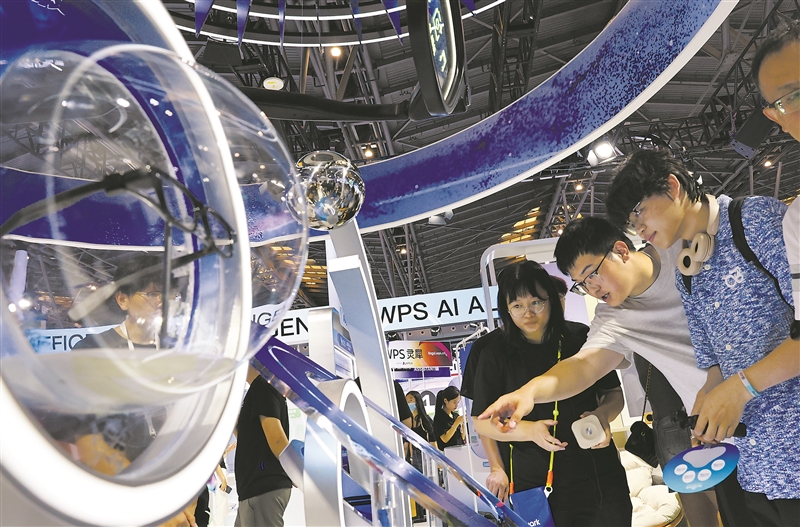 参观者在2025世界人工智能大会现场的一个智能眼镜展台前交流讨论。新华社记者 方喆摄