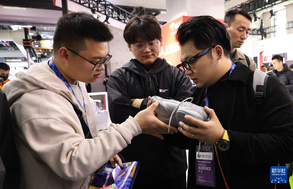 3月12日,参观者在东方枢纽展区现场查看一只由热塑性聚氨酯弹性体TPU材质3D打印的可穿运动鞋。