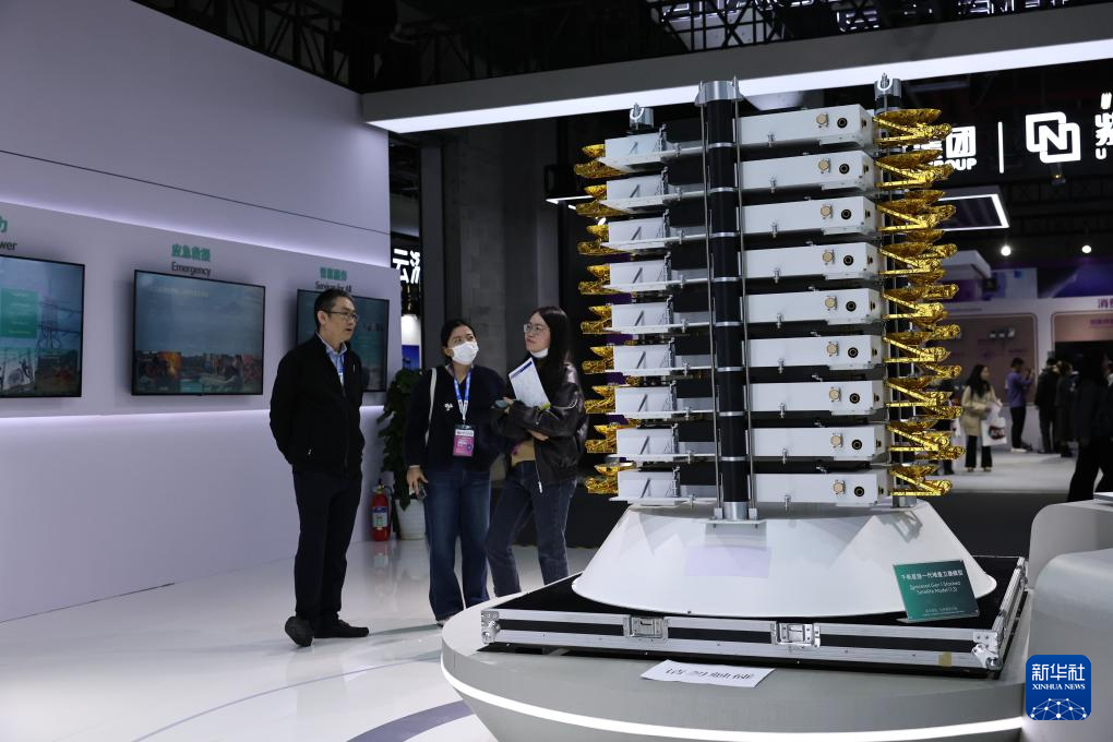 3月12日,参观者在东方枢纽展区内展出的千帆星座一代堆叠卫星模型展品旁交流讨论。