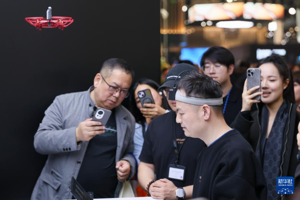 3月12日,在上海新国际博览中心追觅科技展位脑机接口展台,工作人员演示通过脑电波操作无人机。