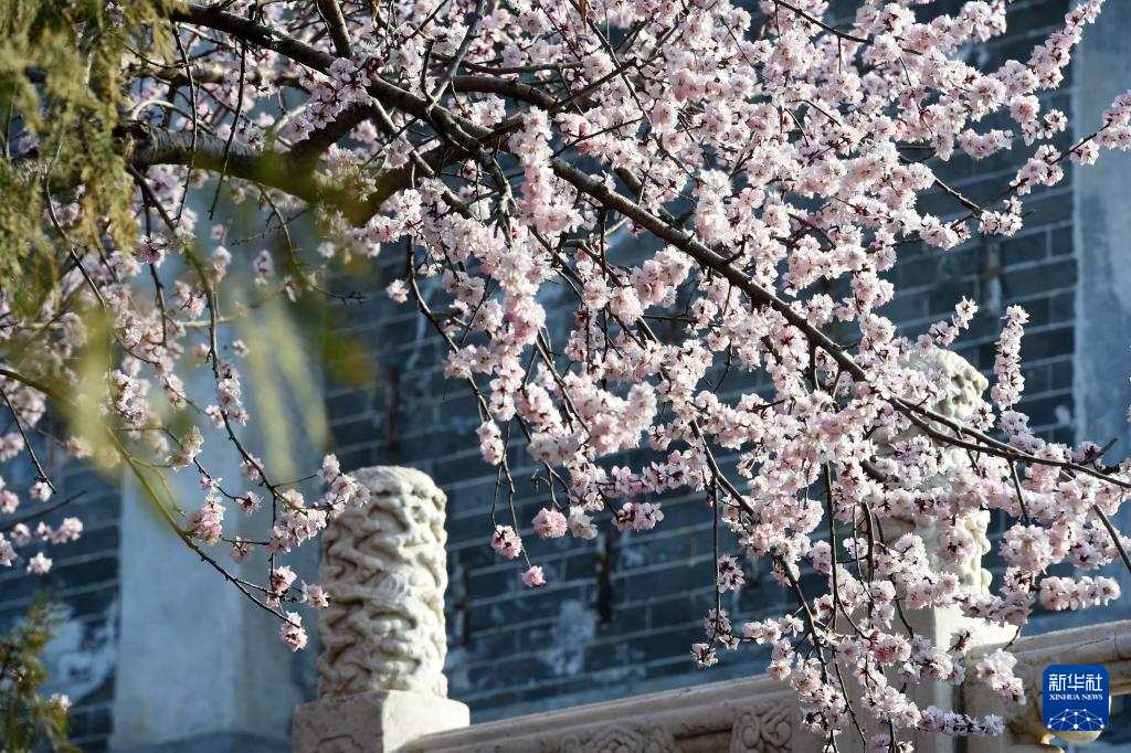 3月16日,一名游客在北京明长城遗址公园欣赏绽放的梅花。