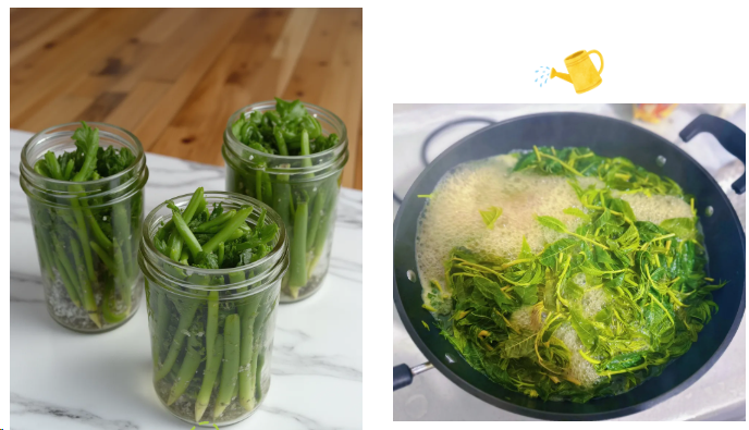 ②焯烫30秒—1分钟,叶片变绿、稍微变软即可捞出;